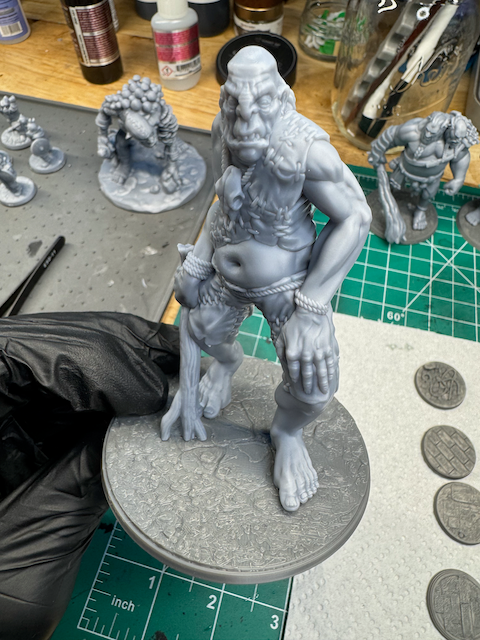 "None" means the bad guys are printed, cleaned up and that's it: no primer, no other finishing. Note that we usually use grey resin, but sometimes they will be other colors, and that UV sensitive resin will continue to cure (and get brittle) the longer they are not primed.